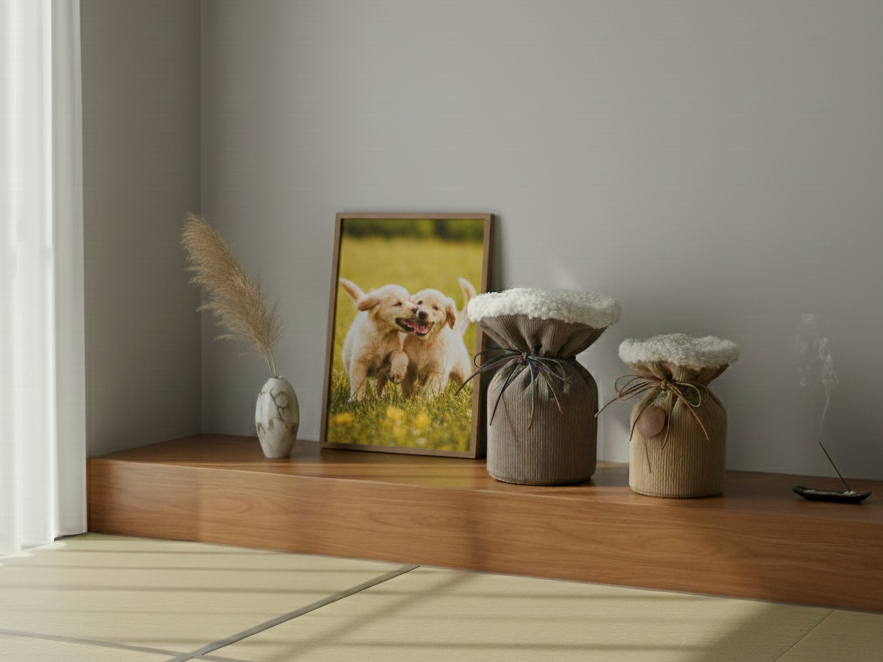 生活空間に骨壺を置かれている方から「できるだけ自然にそばに置いてあげたい」「リビングに置いても違和感のないデザインがいい」というお声をよくいただきます。弊社ではそういったご意見を基に「温もりのある素材感」や「インテリアに溶け込むデザイン」などにこだわり、ペットちゃんを身近に感じながら皆様が少しでも穏やかな気持ちで過ごせるよう…そんな想いで「なないろオリジナル骨壺カバー」の製作を心がけております。